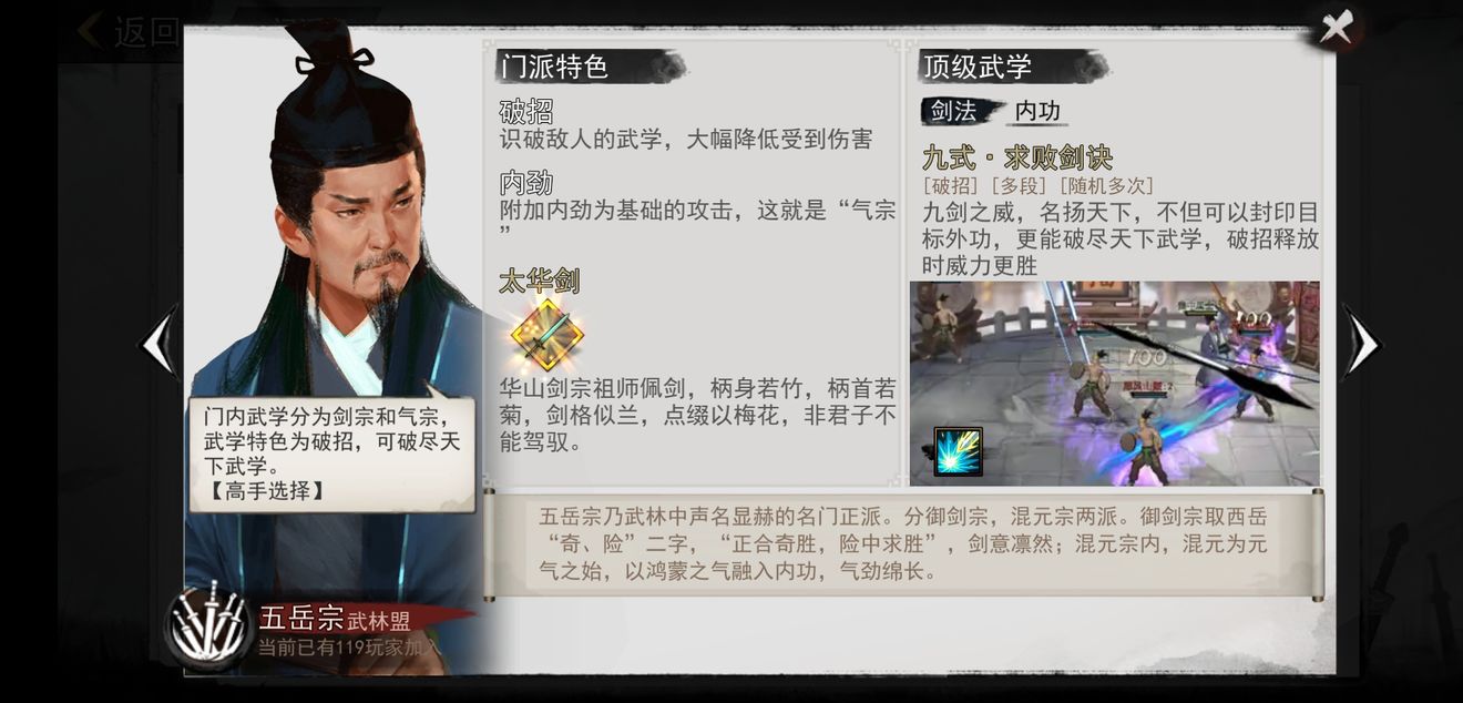 1、五岳宗擅长拳法和剑,有九式求败剑诀、太华混元掌、五岳独尊剑等秘籍;