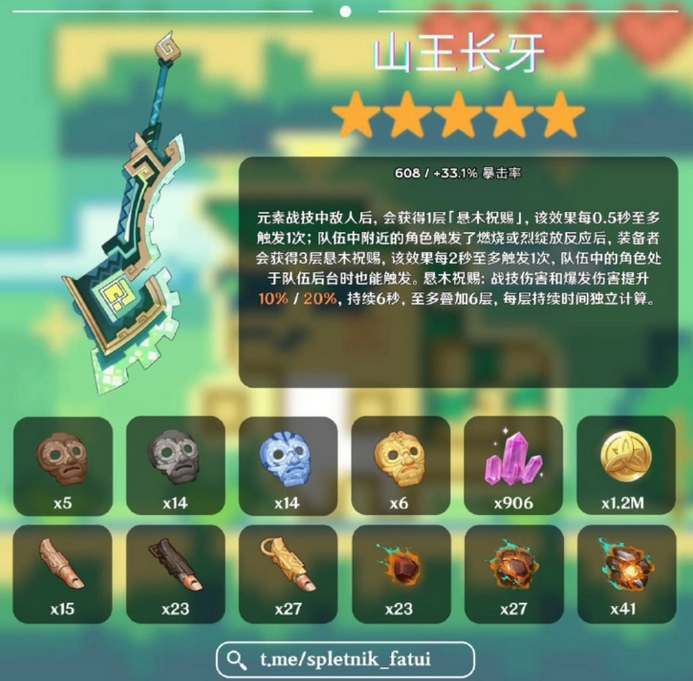 3、基尼奇专武-山王长牙属性以及突破材料如下图所示: