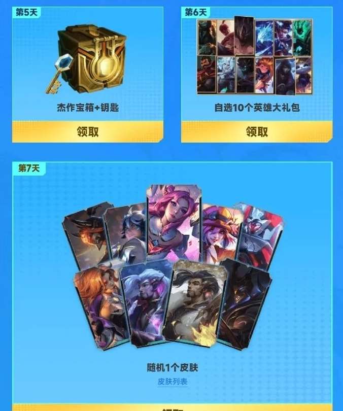 此外连续7天每日进入游戏打卡可获得奖励,第5天给杰作宝箱和钥匙,最后一天可以领取一个未拥有皮肤。