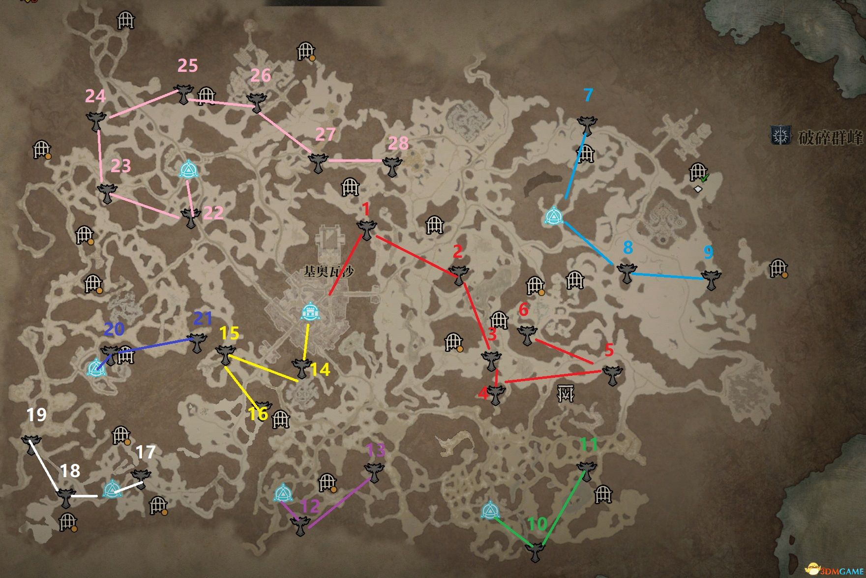 笔者按照不同颜色划分了线路,每个祭坛上也有标号,玩家可以对照后面的详细位置图来收集。