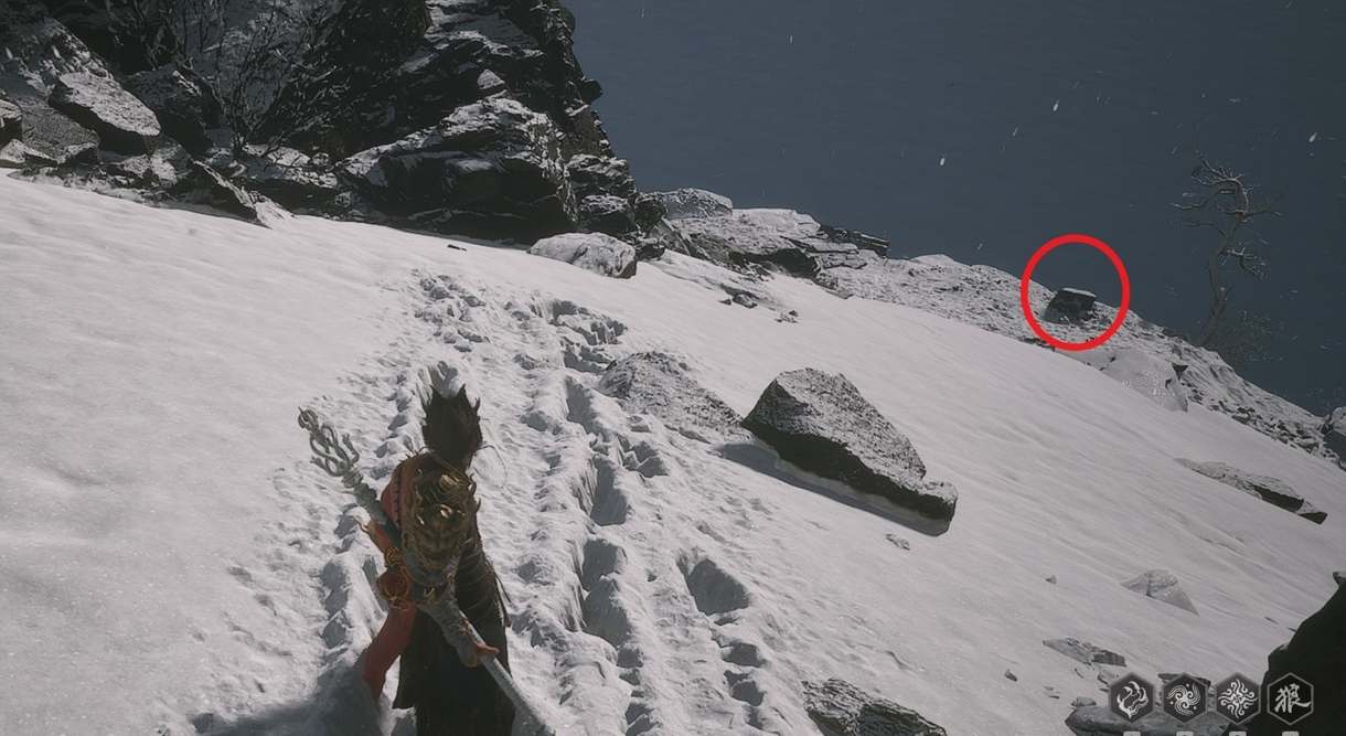 3、路线如下图所示:走到两块大石头之间就可以看到下层了。