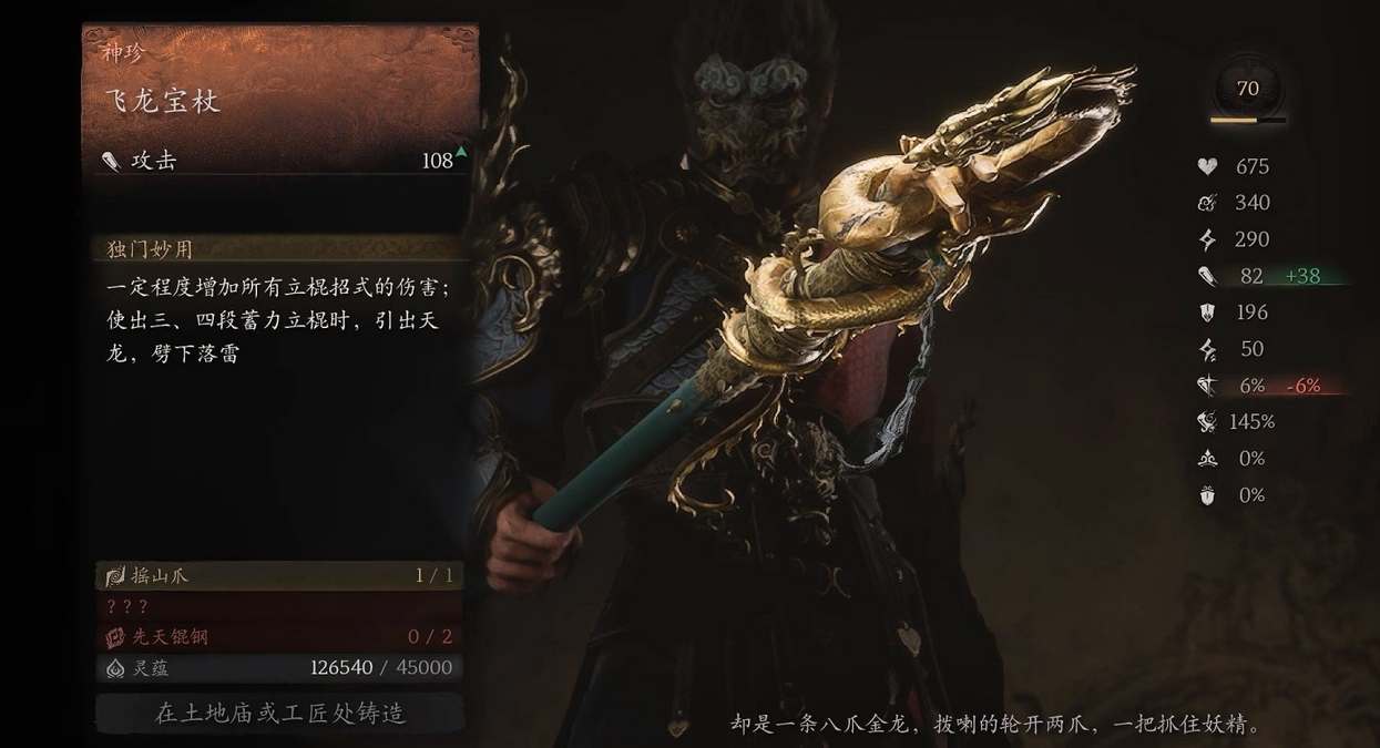 4、飞龙宝杖提供108攻击力加成,面板与武器样式如下图所示。装备后可以增加立棍招式伤害,并且在释放三、四段蓄力的时候会引出落雷攻击敌人。