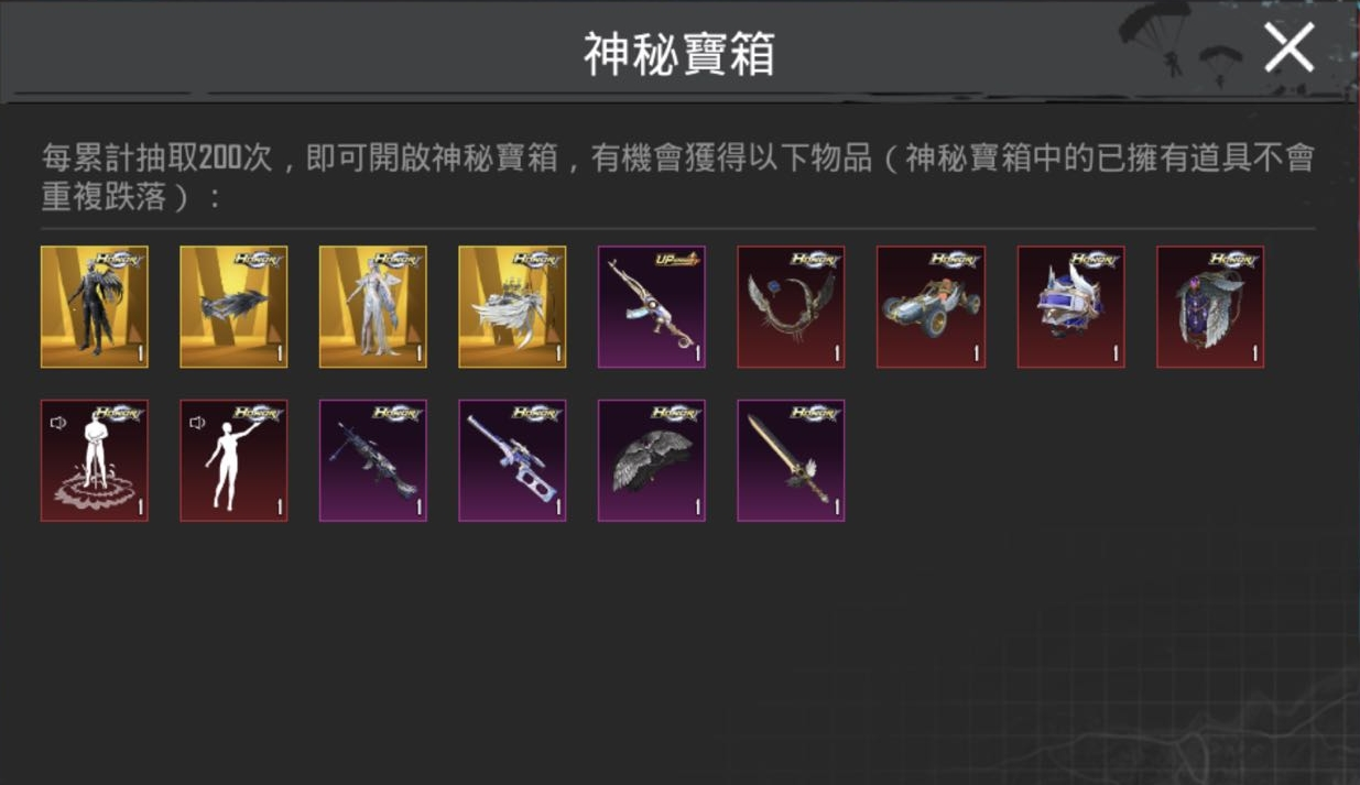 每次抽奖均可累积1点神秘宝箱进度,每累计抽取200次即可开启1次,神秘宝箱中已拥有的道具不会重复跌落。