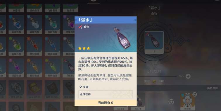 7、把游戏时间调到晚上,然后去传送点旁边找NPC对话就可以获得【强水配方】,然后就可以在合成台处制作药剂了,这个药剂可以提升暴击率和物理伤害,但同时也会提高角色受到的伤害。
