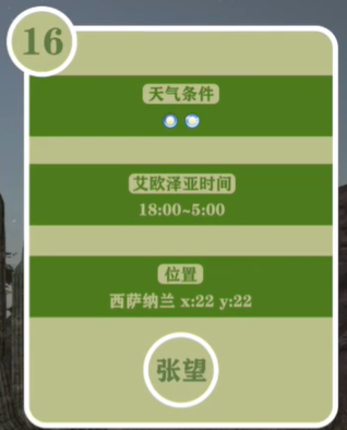 我们要在晴朗天气的18:00-5:00来到西萨纳兰x:22 y:22的地方。