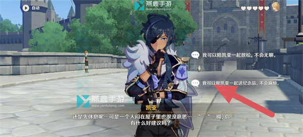 7、对话选择【我可以帮凯亚一起送纪念品,不会麻烦。】。