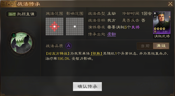 战法简介:非常优秀的单体奶技能 奶量不低而且加减伤,最重要的是回合是0 每回合都可以使用。