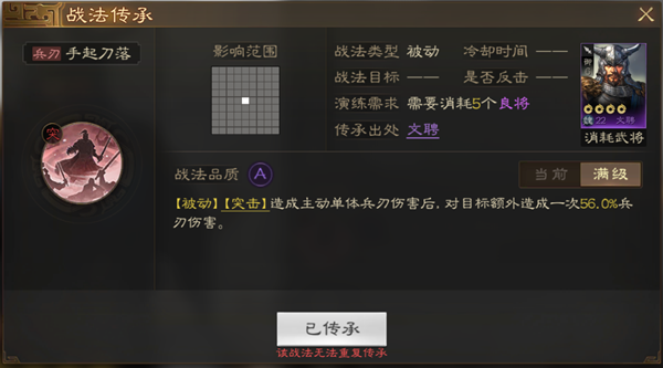 必拆说明:这个技能不光是主动战法可以生效,普通攻击也是可以只要是单体伤害就能触发而且加的武力值特别高后期能加到100多,颜良特别适合这个技能因为颜良自带控制可以减少到对方的统率。