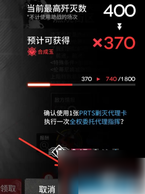 在剿灭作战中使用PRTS剿灭代理卡即可激活全权委托代理指挥功能,可以跳过作战记录并且以该剿灭无助战时的最高歼灭数计算报酬。