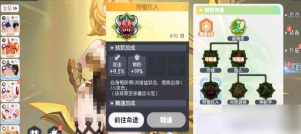 最后就是转职成狩猎狂人,这个属于斥候系的分支,转职成功后会获取物理防御以及攻击力的加成。机制特色则是每获取增益则增加一定程度的攻击力,并且需要叠层,最多只能叠10层,他在转职之后,无论是攻击力还是数值加成一类,他都比不上前两个职业,但是它的优势也非常明显,就是泛用性极强,适配度超高,在搭配多种增益阵容的时候。都有极强的适应性,而他本身攻击力不足的问题,则可以通过装备等词条来补充,在搭配方面的表现更为优异。