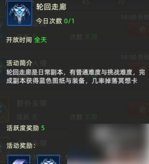 3、日常更多:更多里面的活动大家经常容易忽略,但是更多里面的轮回走廊每天是必做的,轮回走廊给蓝装,有几率给图纸,后期还有几率给机甲,都是不绑定可以赚米的。